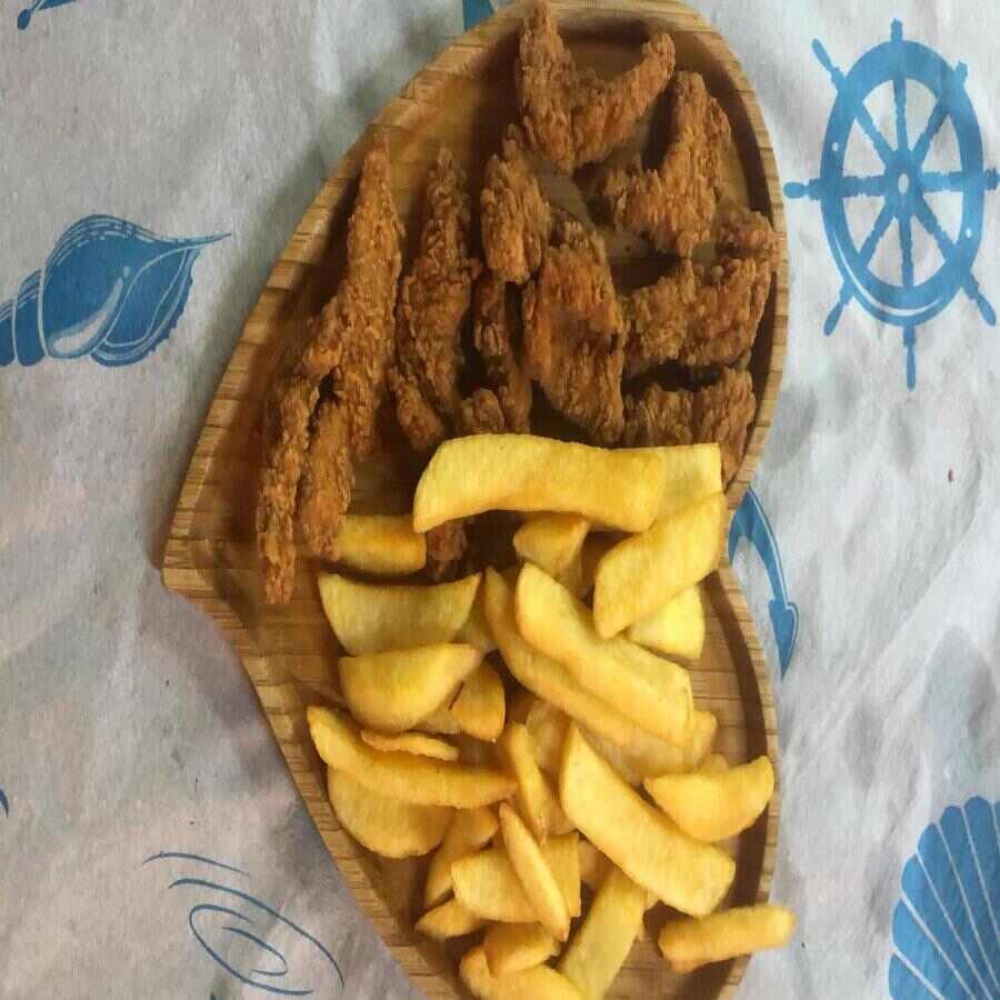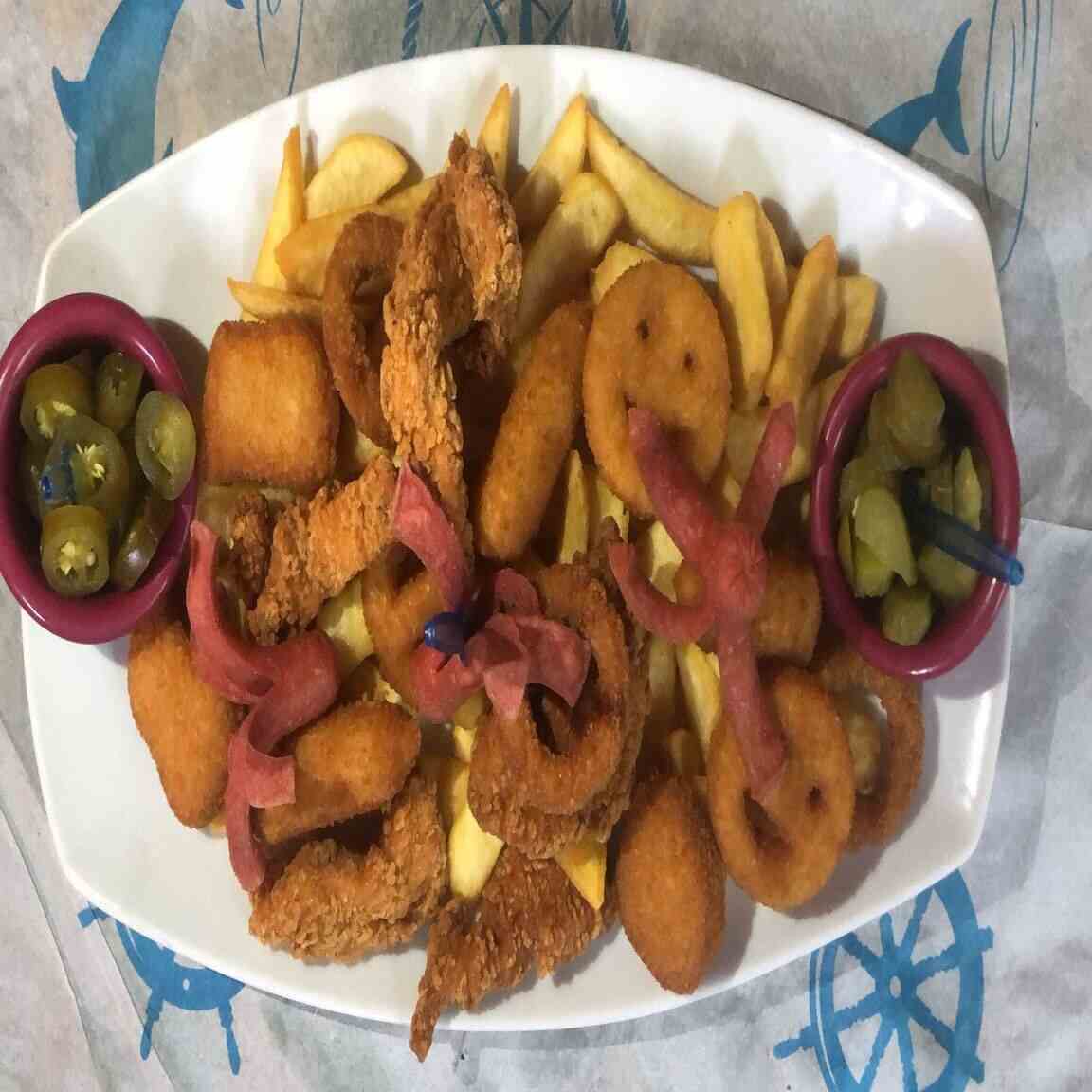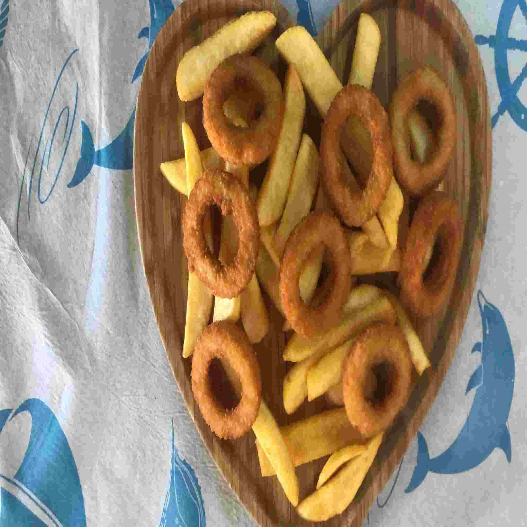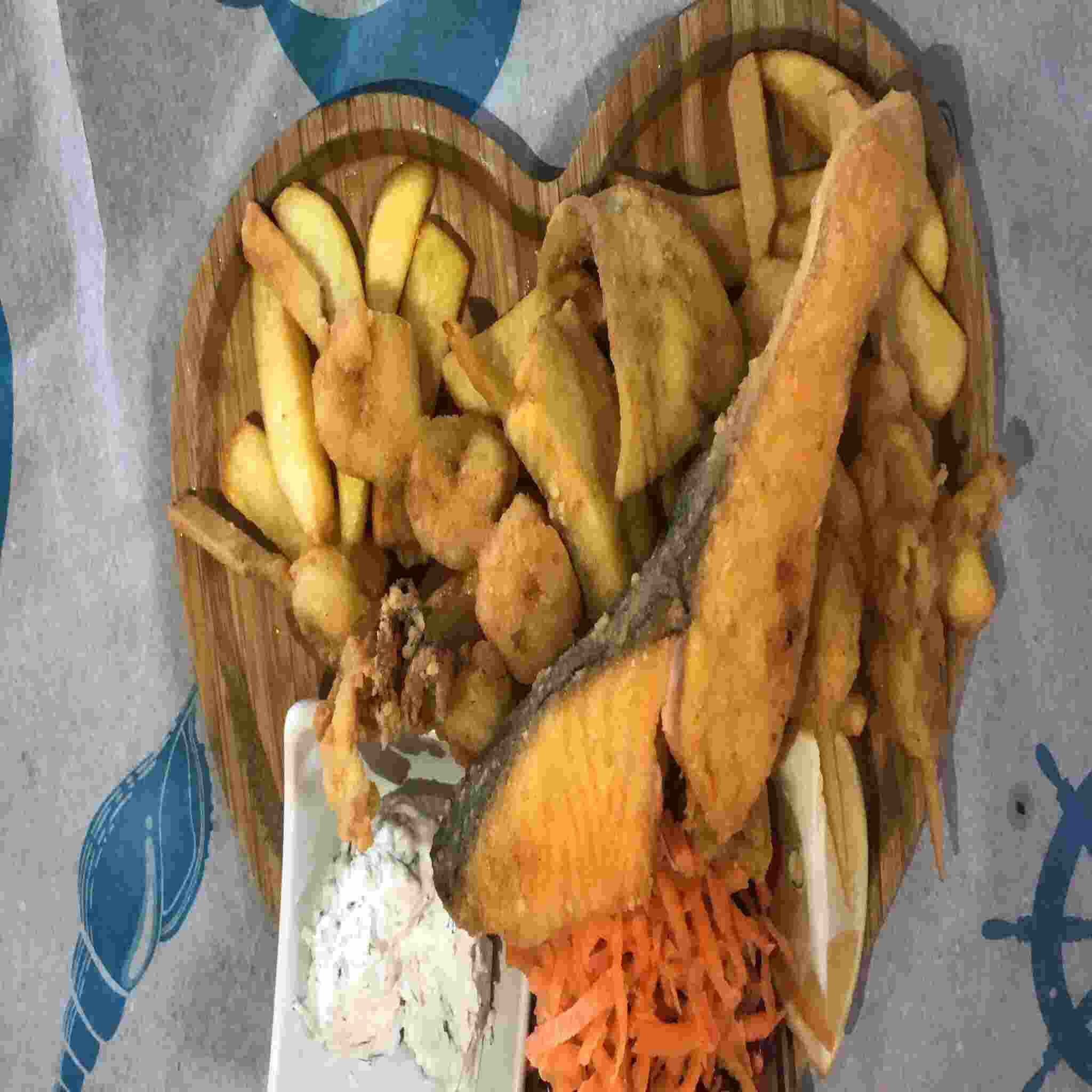 Mezgit, sardalye, Karides, Kalamar, Mevsim yeşillikleri. Özel sos ve kızarmış patates ile...