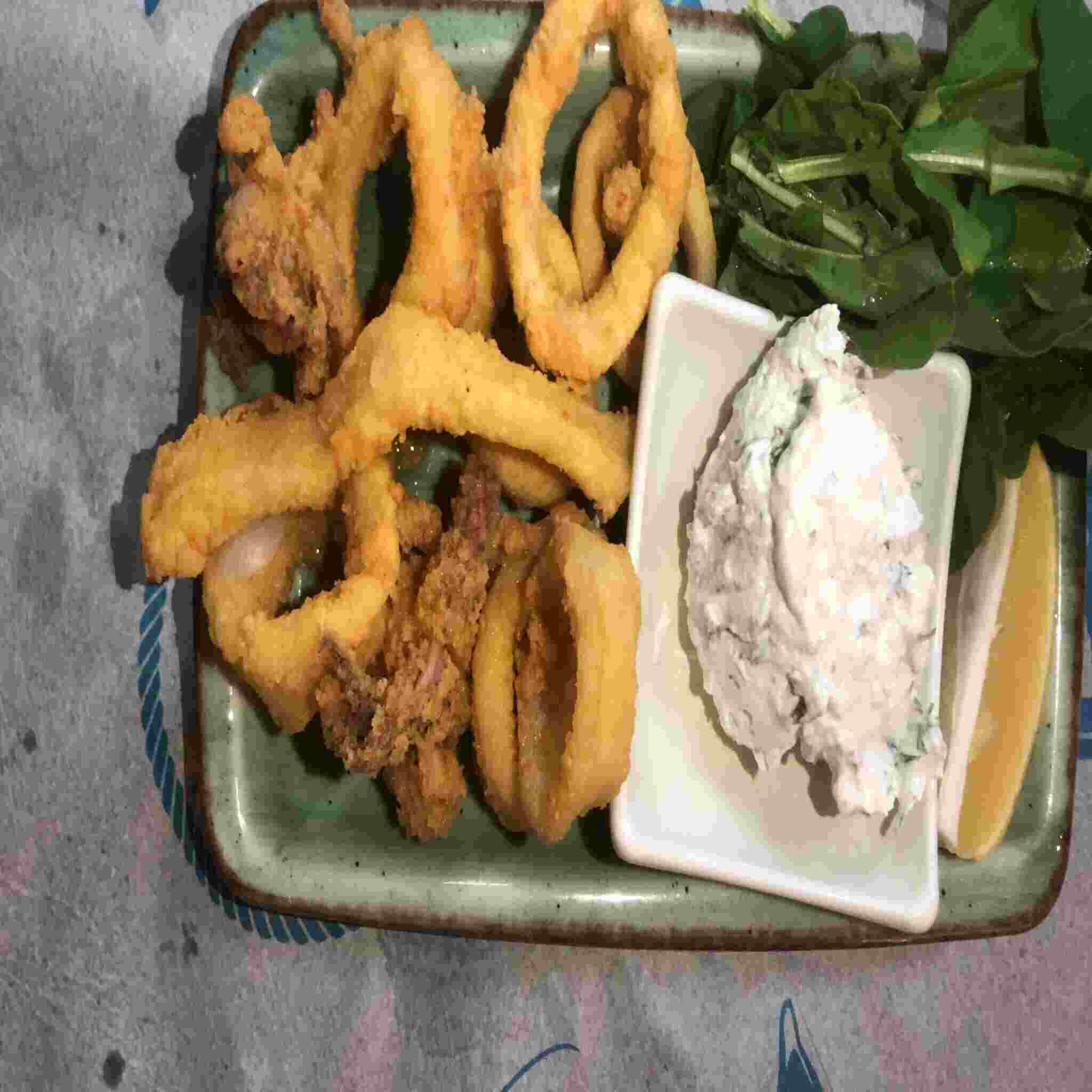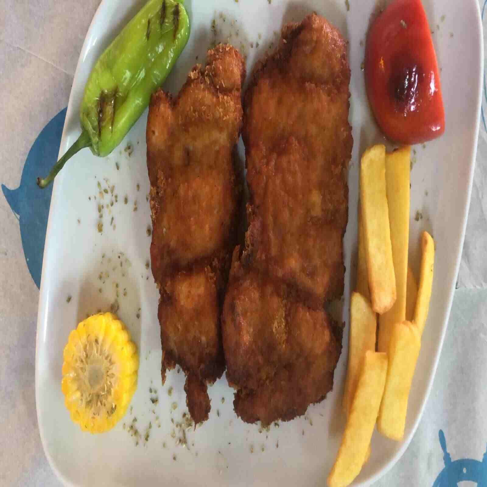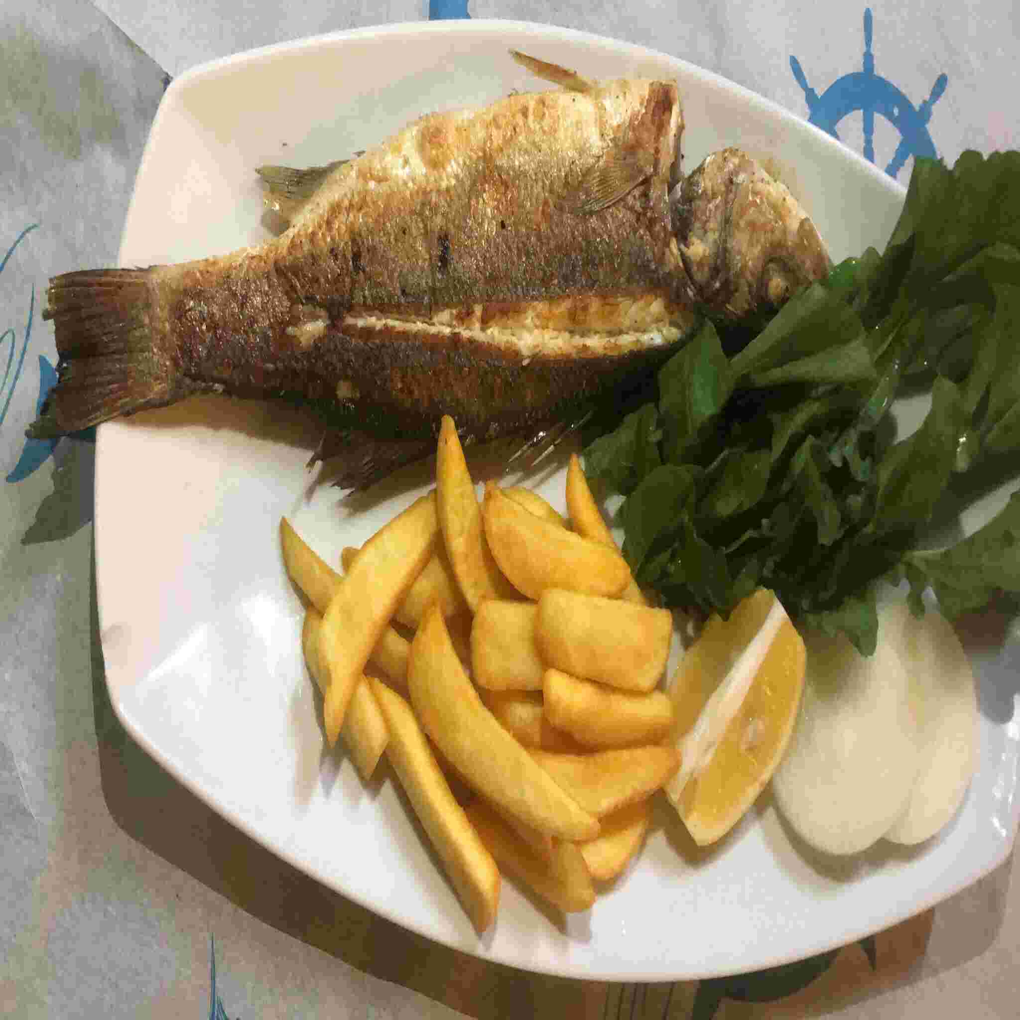 Mezgit, sardalye, Karides, Kalamar, Mevsim yeşillikleri. Özel sos ve kızarmış patates ile...