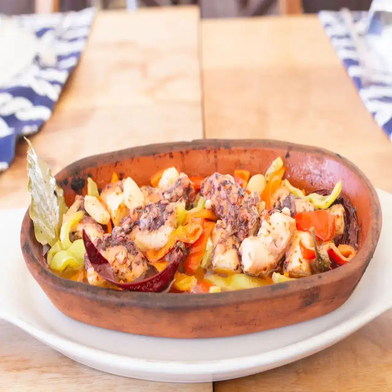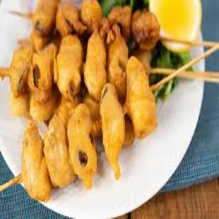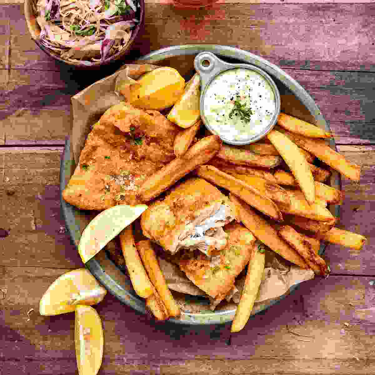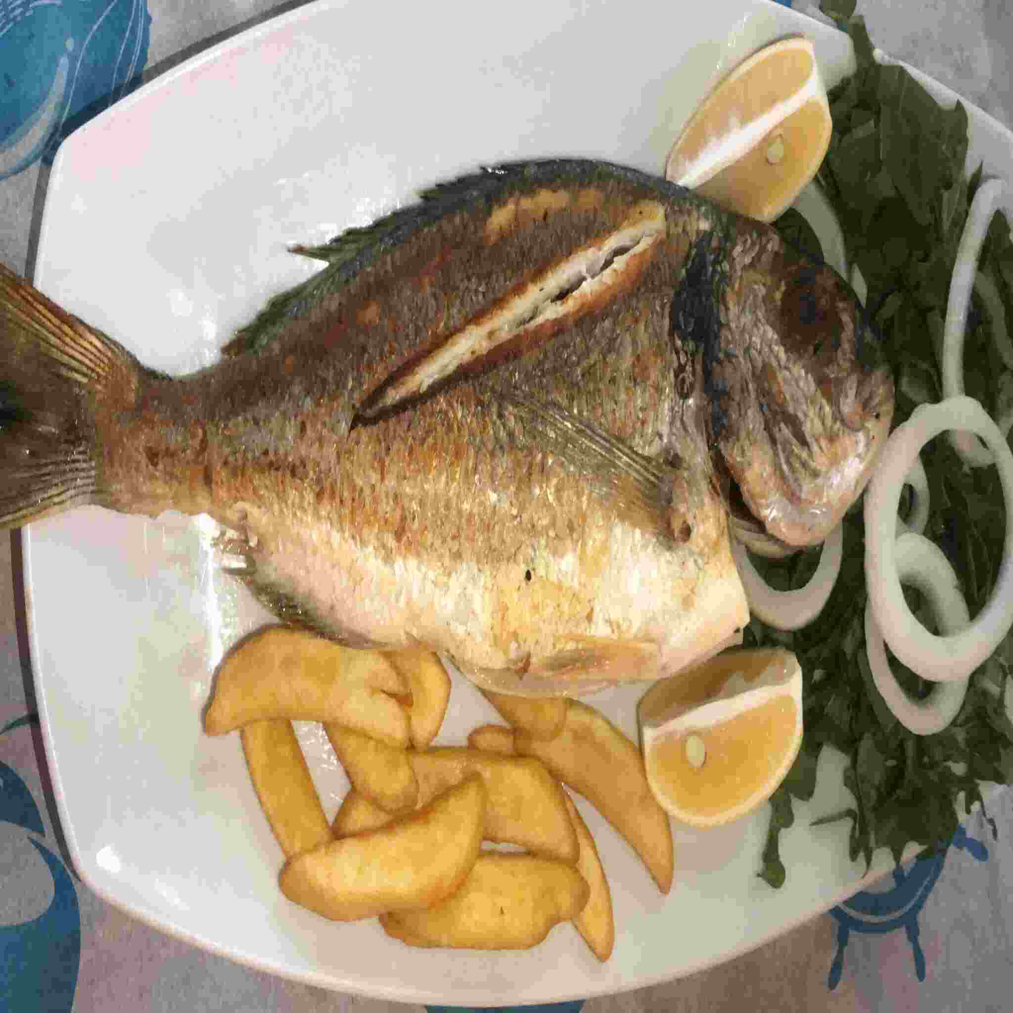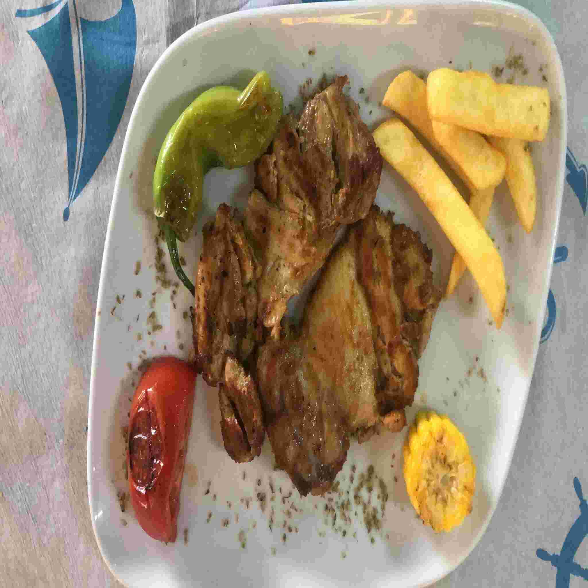 Mezgit, sardalye, Karides, Kalamar, Mevsim yeşillikleri. Özel sos ve kızarmış patates ile...