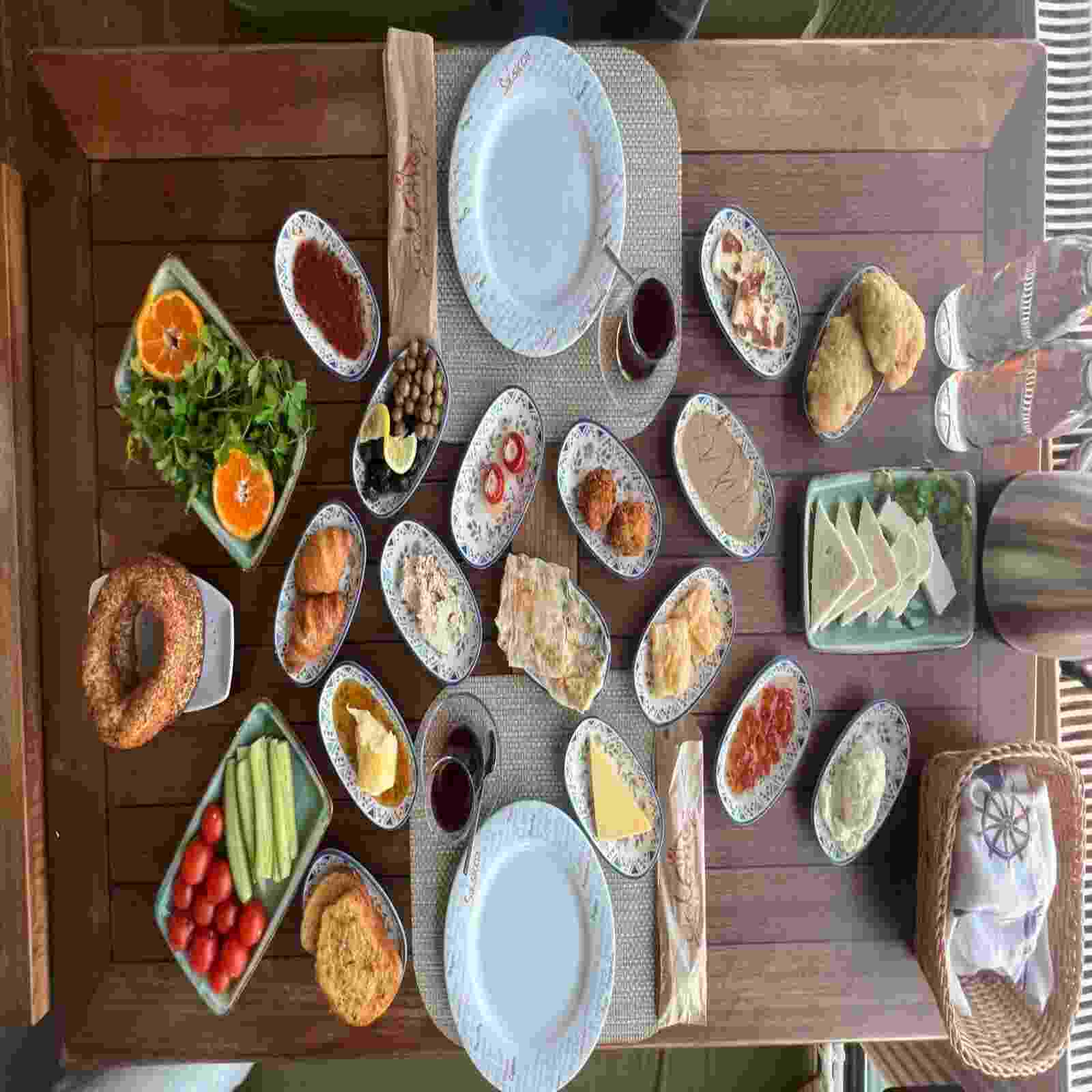 Beyaz ve hellim peyniri, Yeşil ve siyah zeytin, domates, salatalık, bal ve kaymak, yağda yumurta, te ... devamını oku!
